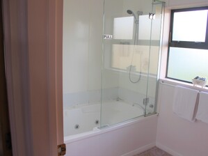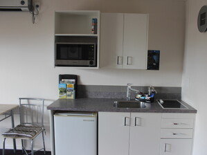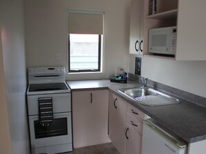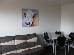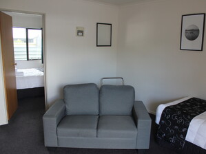 A large 1-bedroom unit with a queen-size bed in the lounge and 2 single beds in the bedroom.