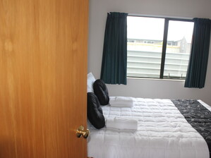 There is a queen-size bed in one room and 2 single beds in the other. These rooms also have a fold-out couch in the lounge for additional guests.